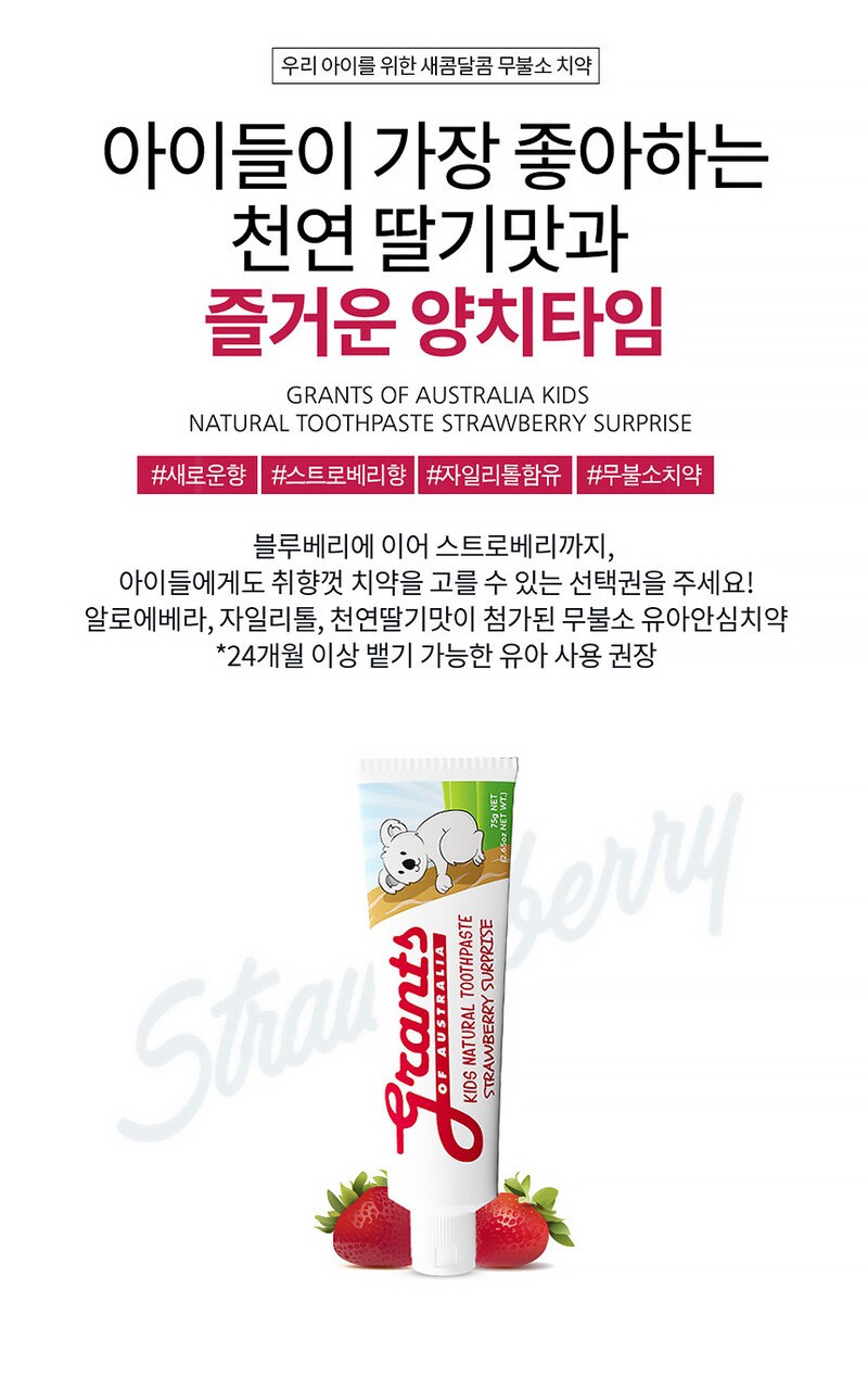 이런 간식을 일절 주지 않고 있던 시기, 처음 유아 치과 검진을 갔을 때도 어금니를 닦은 적이 있어 단 것을 자주 먹고 있는 요즘 아이들의 치아 관리에 특히 신경을 쓰고 있습니다.아이들 치아 관리는 어떻게 하고 있나요?우리 아이는 아직 제대로 토하지 않은 유아이기 때문에 무불소 치약을 사용하고 있습니다. 요즘은 호주에서 온 그랜츠라는 브랜드를 알고 키즈라인 스트로베리 맛, 블루베리 맛으로 사용하고 있는데 사용할수록 만족스러워서 육아 아이템 추천드리려고 가져왔어요~